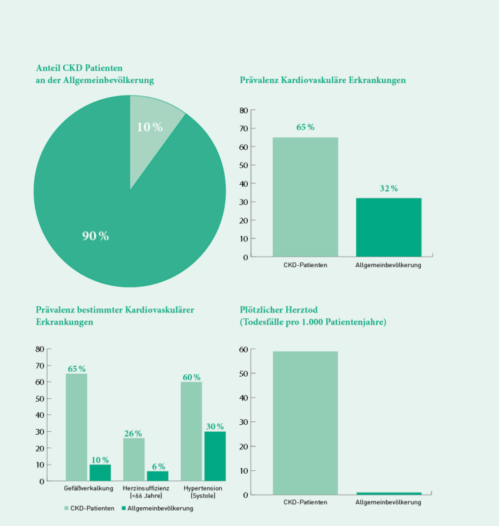 Etwa die Hälfte der Patienten mit CKD im Stadium G4-G5 leidet an einer CVD. Sie haben eine doppelt so hohe Prävalenz für kardio­vaskuläre Erkran­kungen im Vergleich zur Allge­meinbevölkerung (65% vs. 32%). Herzinsuffizienz tritt bei CKD-Patienten über 66 Jahren deutlich häufiger auf (26% vs. 6%), bei Dialysepatien­ten liegt die Prävalenz sogar bei 44%. Zudem ist das Risiko für plötzlichen Herztod bei Dialy­se­patienten im Vergleich zur Allgemeinbe­völ­kerung stark er­höht (59 vs. 1 Todesfälle pro