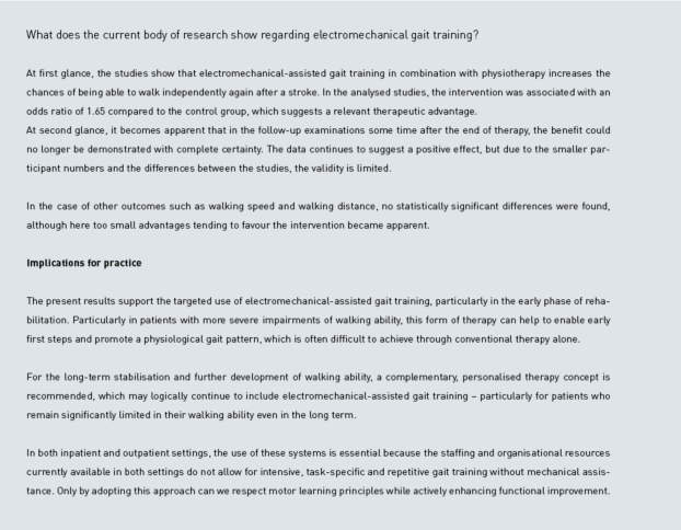 The review concludes that electromechanical-assisted gait training in combination with phy-siotherapy following stroke may, with moderate certainty of evidence, help to restore independent walking ability. Based on the available data, it is estimated that approximately nine patients need to be treated in order to prevent sustained walking dependency in one patient (Number Needed to Treat = 9).
