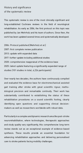 - Mehrholz J, Kugler J, Pohl M, Elsner B. Electromechanical-assisted training for walking after stroke. Cochrane Database of Systematic Reviews 2025, Issue 5. Art. No.: CD006185. DOI: 10.1002/14651858.CD006185.pub6. https://www.cochranelibrary.com/cdsr/doi/10.1002/14651858.CD006185.pub6/full