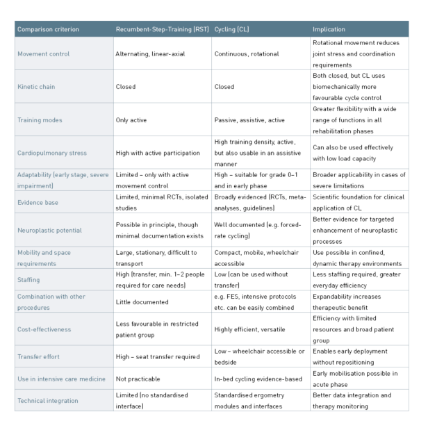 By comparison, CL offers a much wider range of therapeutic applications, ranging from passive early mobilisation on the intensive care unit to assistive-symmetrical motor relearning for severe hemiparesis to active high-intensity training protocols for secondary prevention. This adaptability is greatly enhanced through motor-assisted movement capabilities and standardised ergometry modules that precisely control the training parameters. The evidence base is comprehensive, spanning from mechanistic studies on muscle activation and neuroplastic reorganisation to randomised controlled trials, meta-analyses and current guideline recommendations. In particular, the integration of CL into early mobilisation protocols in intensive care units, alongside neurorehabilitative and geriatric care standards, highlights the significant clinical value of this training approach.